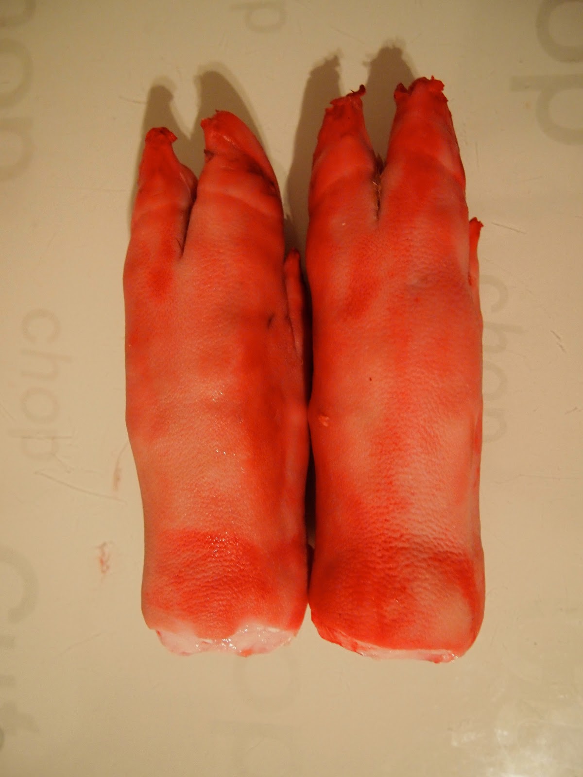 Wash the trotters, remove any visible dirt (especially under the toe-nails) and hair. If you have a blow torch, use it to burn the hairs if necessary, this will make them easier to remove. You can ask your butcher to cut the trotters into chunks, or you can run a sharp knife down the middle to split it in half.