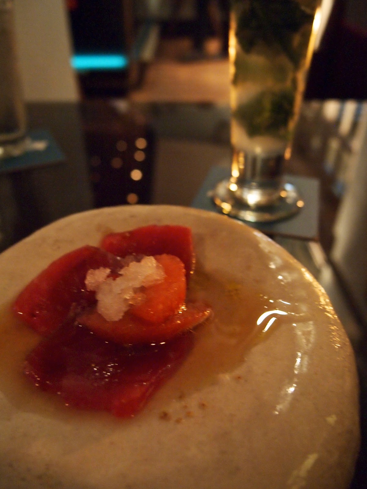 Served with the drink was Tuna crudo, grapefruit, lemon and bergamot granita. The whole dish came together nicely, excellent quality tuna, the grapefruit was not overpowering. The sauce tasted like a very light soy sauce with mirin and a hint of Shiso.