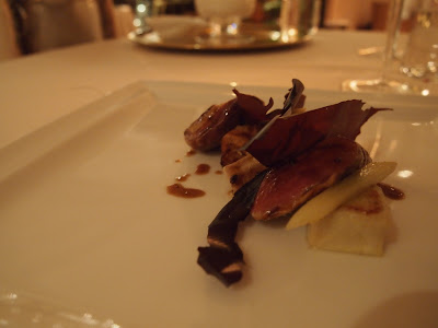 Grilled boned pigeon with smoked eel, lychees and chocolate shavings (2009) - I loved the pigeon, lychees and the smoked eel, but I didn't know what to do with the chocolate shavings. They were thin and bland, and not really necessary.