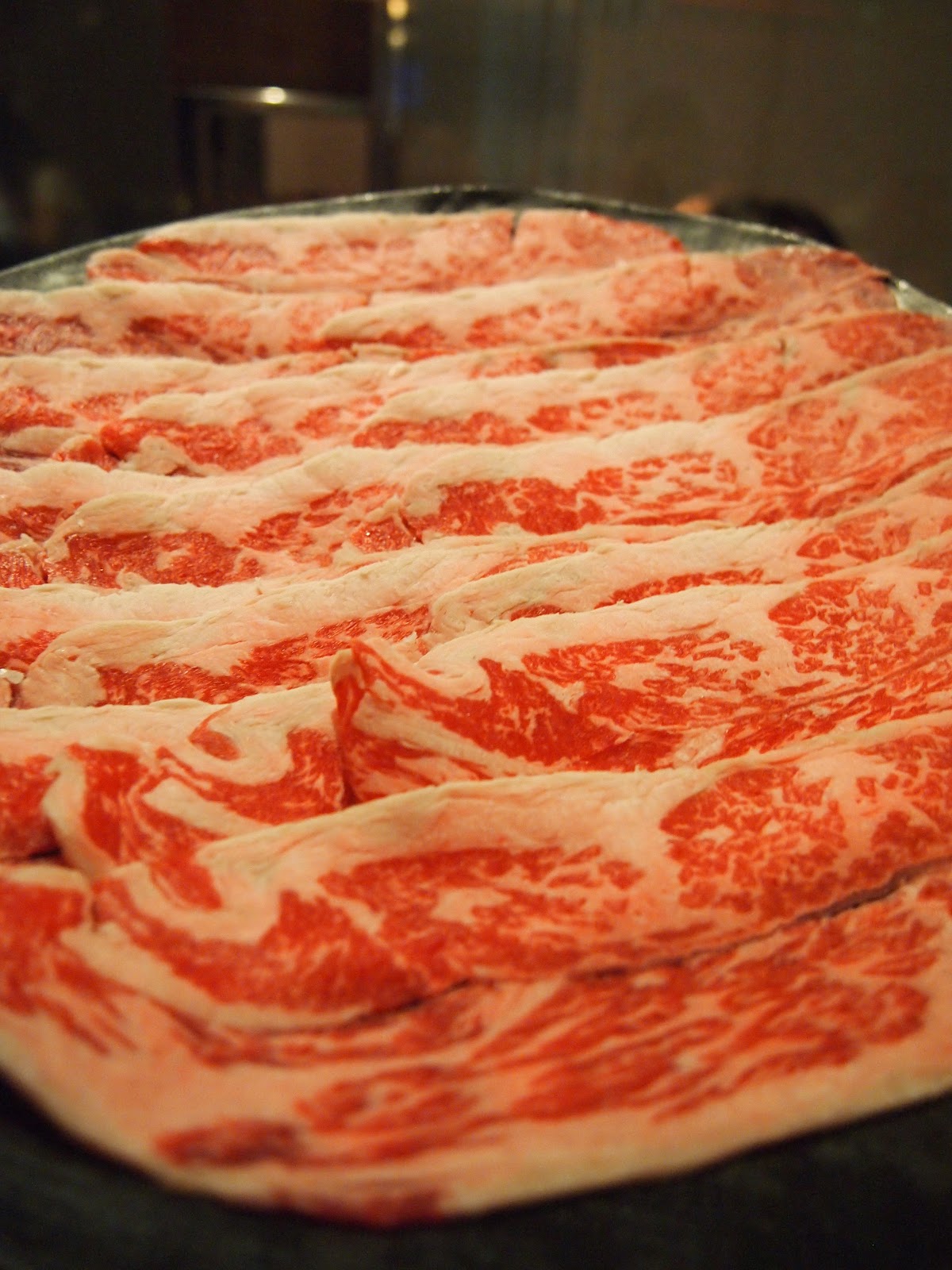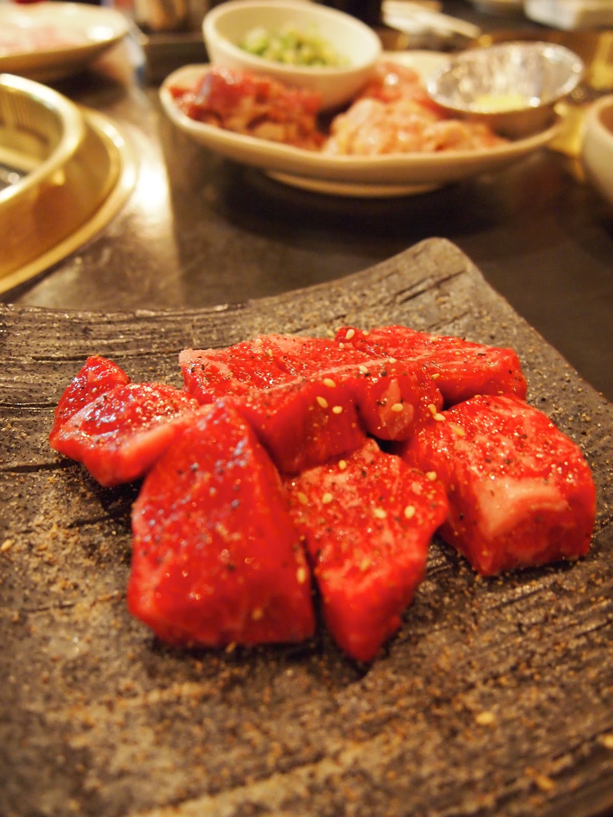 Left to right: Slices of marinated beef, cubes of marbled beef