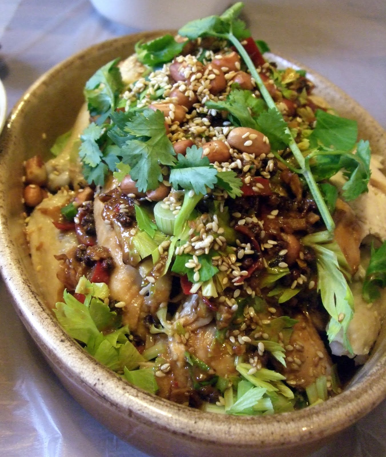 "Mouth Watering Chicken" originated in the Sichuan Province, China. Sichuan cuisine has become very popular in the last few years. The first Sichuan 'dish' I tried was the hotpot - cook your own meat in a simmering meaty stock filled with red peppercorns, star anise and lots of Sichuan peppercorns. The fun bit is to pick the Sichuan peppercorns out when you try to eat the meat. But you're always gonna miss a few, as they are literally all over the place! Nearest description of the taste of Sichuan pepper would be popping candy. It makes your tongue go numb followed by a hint of spiciness, almost like the aftertaste of eating wasabi.