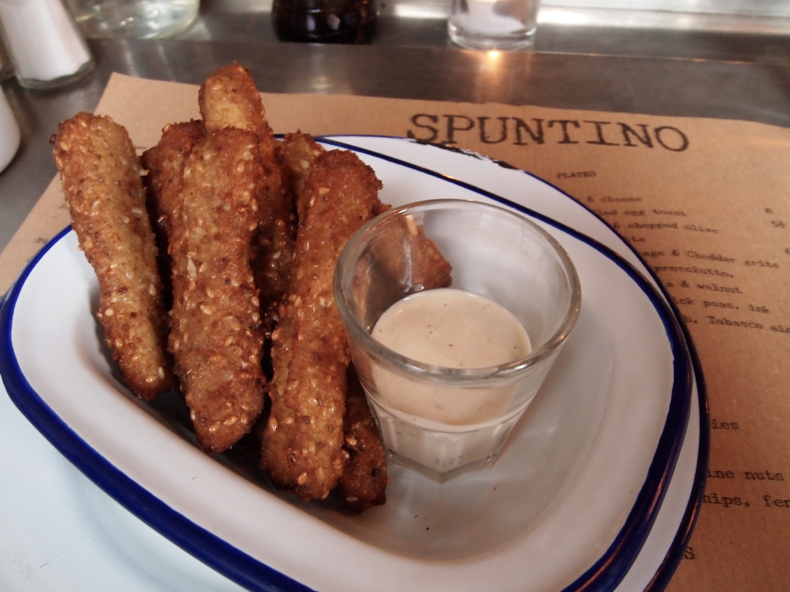 Eggplant chips. Inside the spiced crunchy breadcrumb coating was melt-in-the mouth aubergine. The fennel yoghurt dip which came with it was light and refreshing.