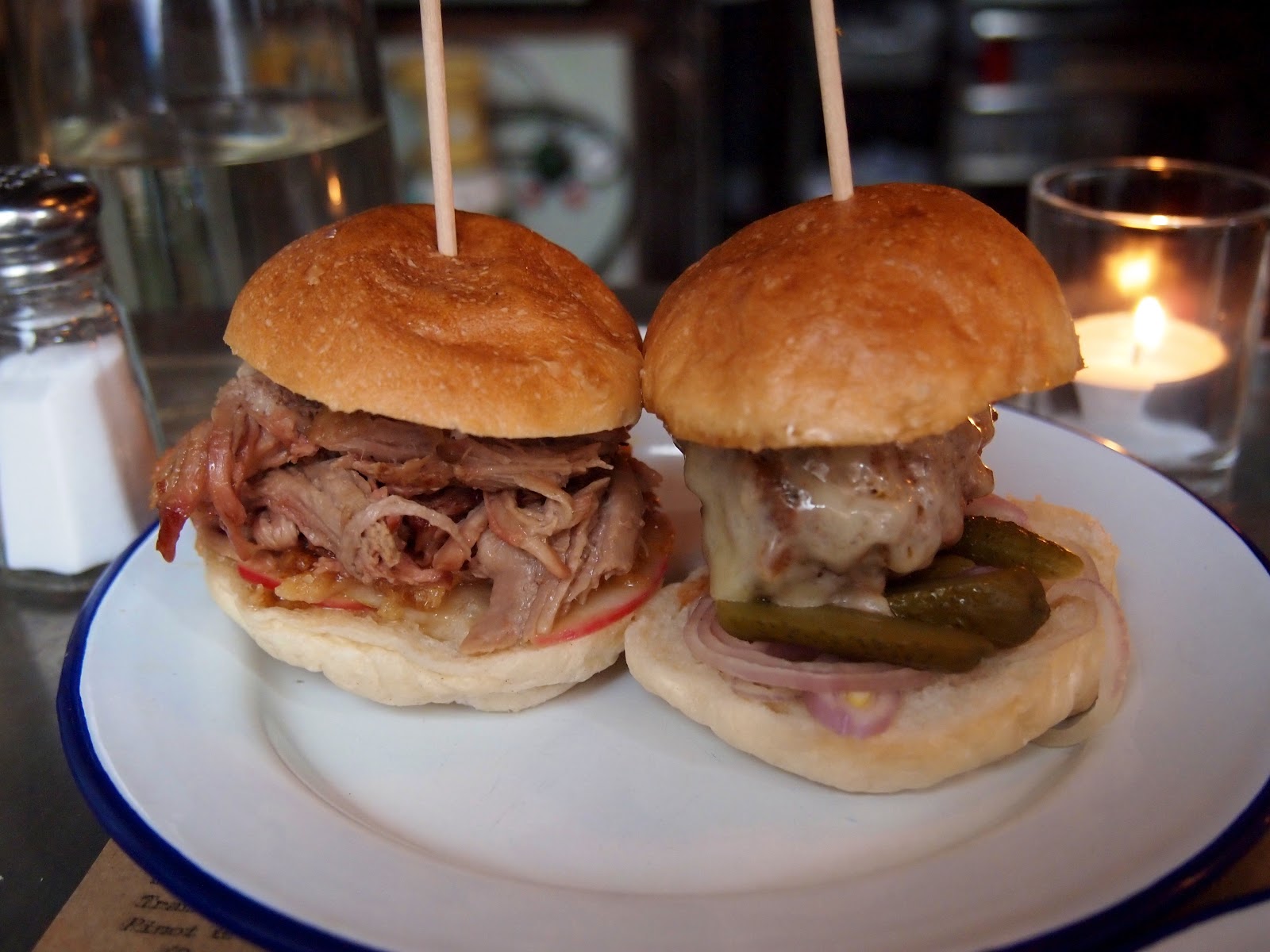 Pulled pork and pickled apple slider (Left). Slices of pickled apple were carefully arranged on the bottom of the burger, topped with a generous amount of pork, and some pieces of crackling. Ground beef and bone marrow slider (Right). It was very enjoyable, cooked medium-well - juicy and oozing with rich meaty flavours. Perfecto!