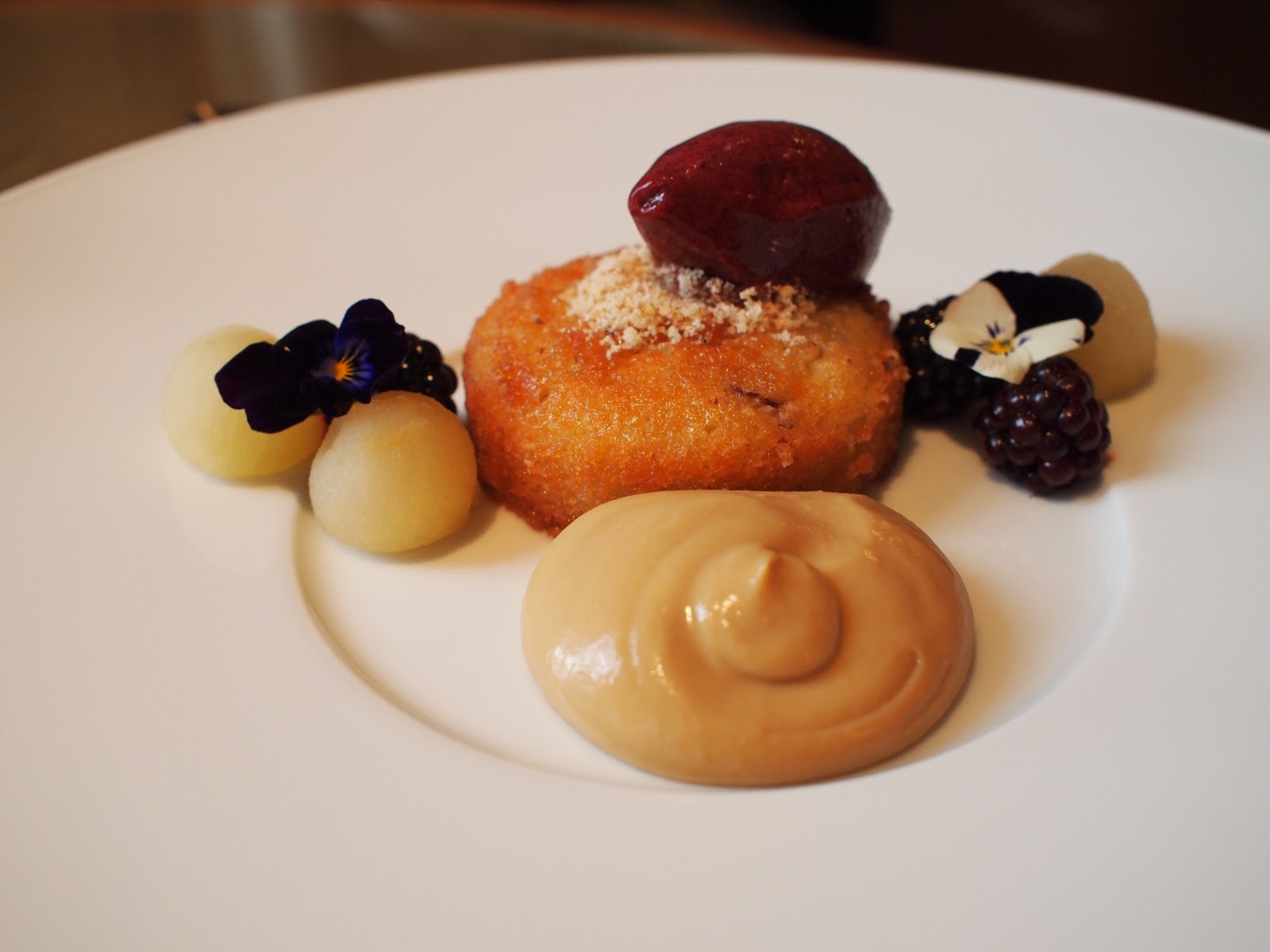 Hazelnut sponge, caramel mousse, blackberry and hibiscus sorbet