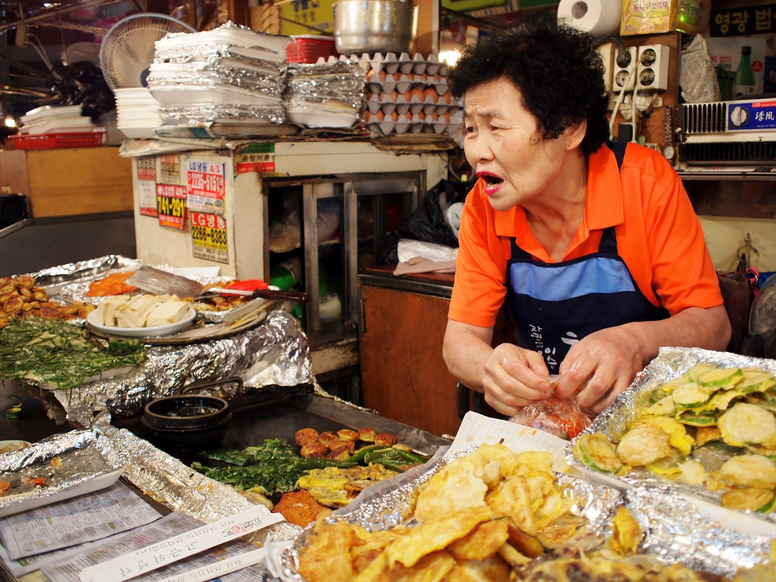 The stalls are mainly run by Korean middle-aged women, who tempt potential customers by waving fried food in their faces. We settled ourselves down with a friendly lady who offered us freshly fried courgette. Later she showed us that she had been in one of the local food magazines, oh bless her.