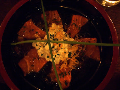 We had some salmon sashimi while waiting for the nabe to cook. It was prepared in the ‘South American Way’, served with avocado, crème fraîche and a yuzu dressing.
