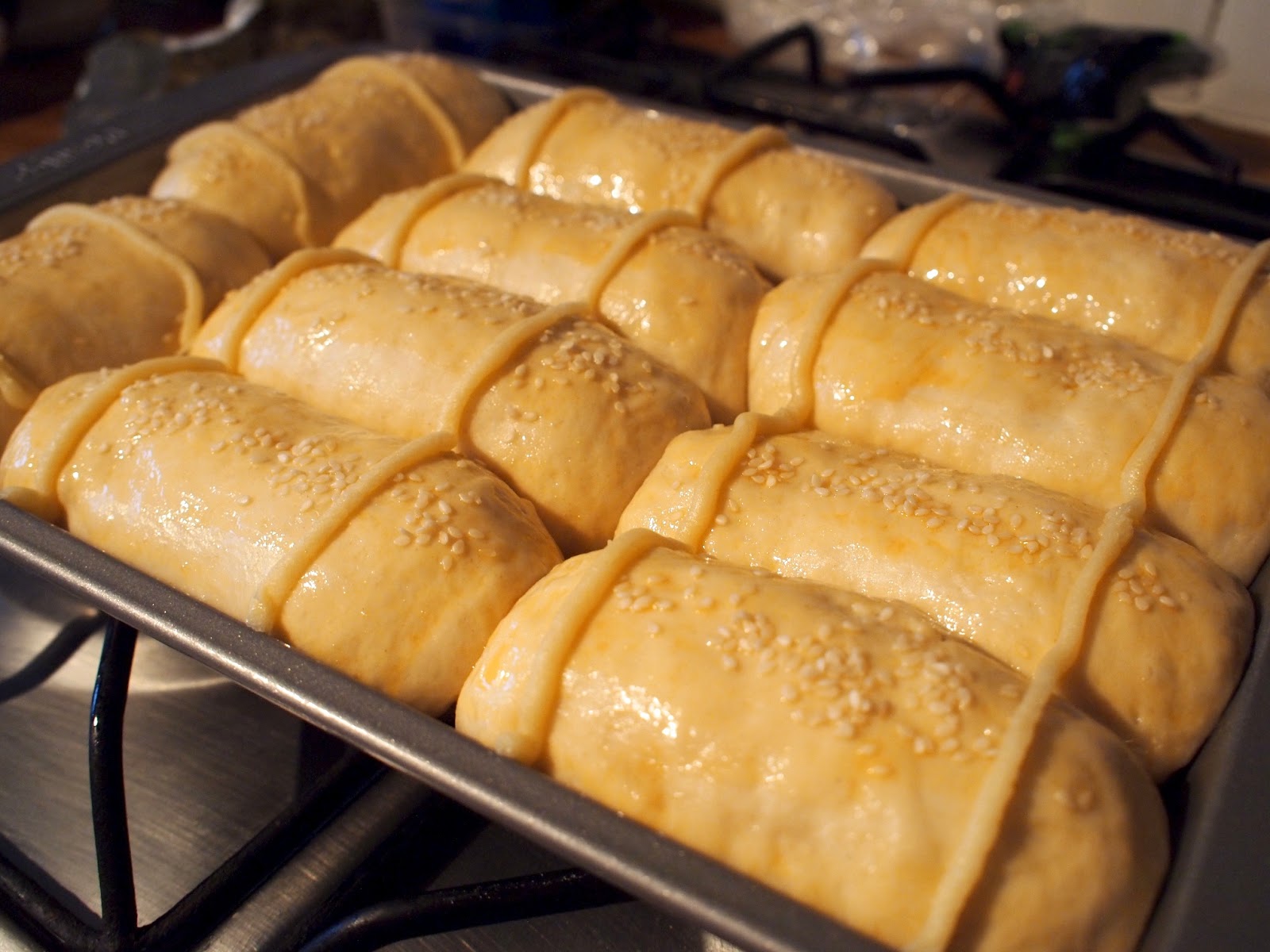 Brush the dough with egg. Pipe two lines onto the dough using the pastry mix prepared earlier, and then sprinkle some sesame seeds on top.