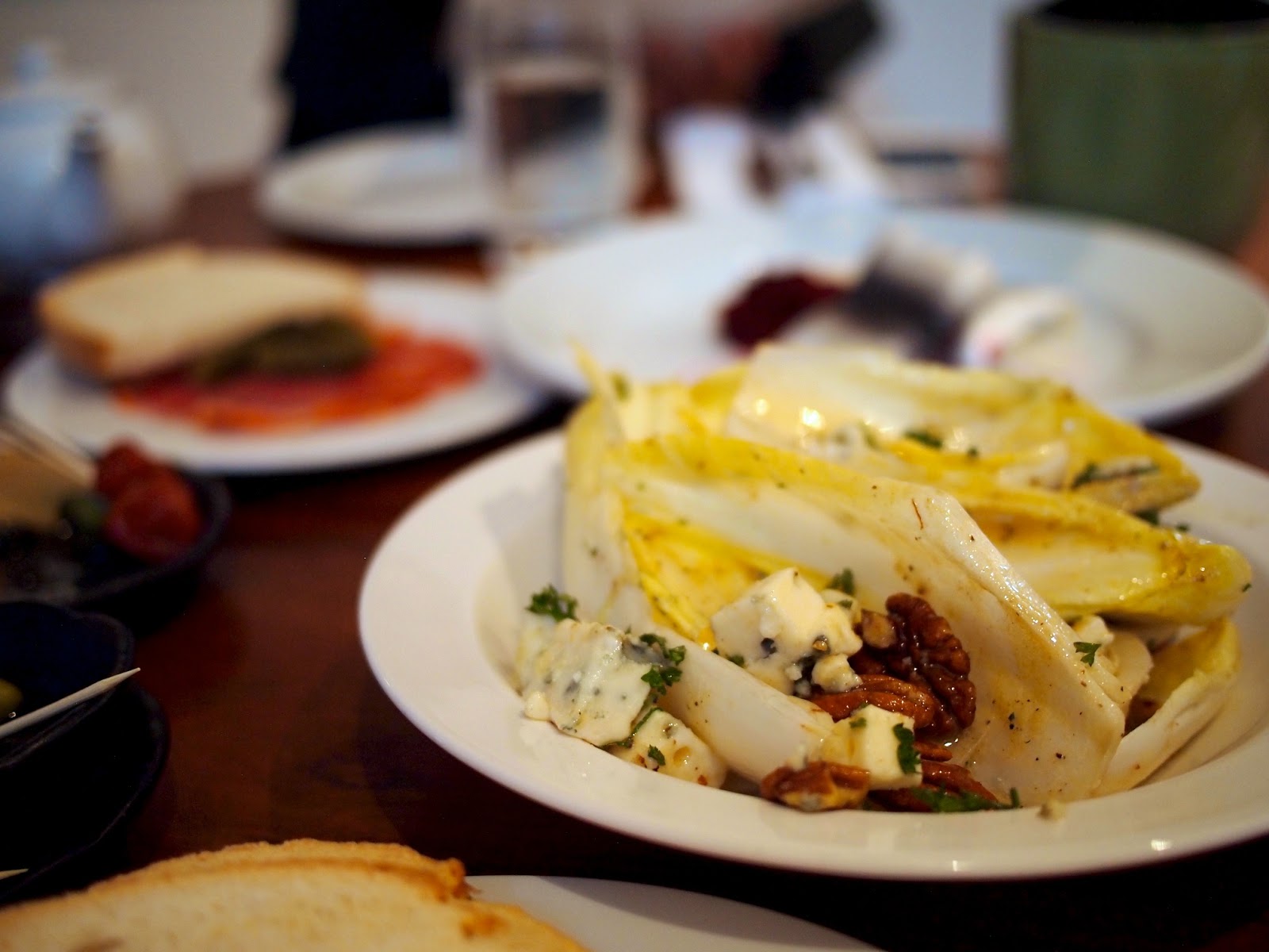 Top: Endive, Roquefort and pecan salad. Middle: Terruel Lomo D.O.P. Bottom: Spice cured beef.